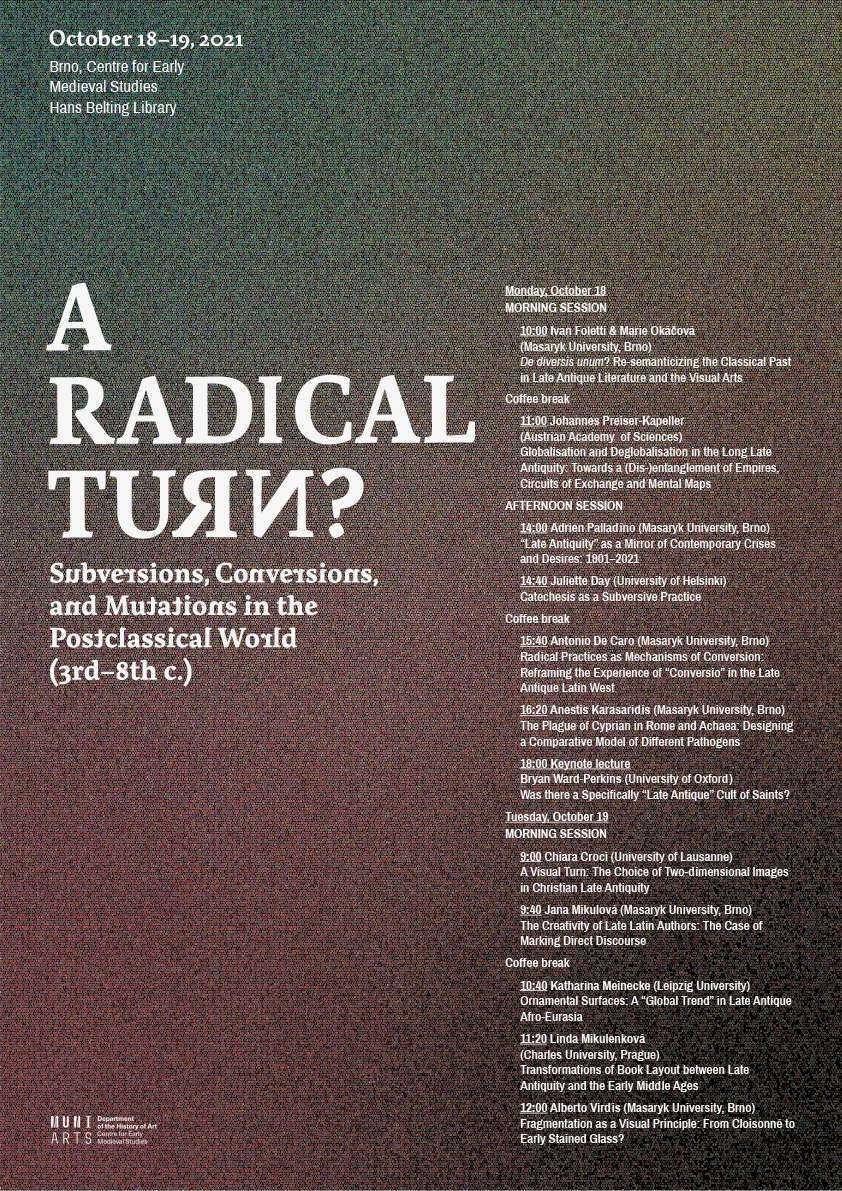 Centrum raně středověkých studií vás srdečně zve na mezioborovou konferenci A Radical Turn? Subversions, Conversions, and Mutations in the Postclassical World (3rd–8th c.), která se tradičně uskuteční v prostorách Knihovny Hanse Beltinga v termínu 18.—19. října 2021.