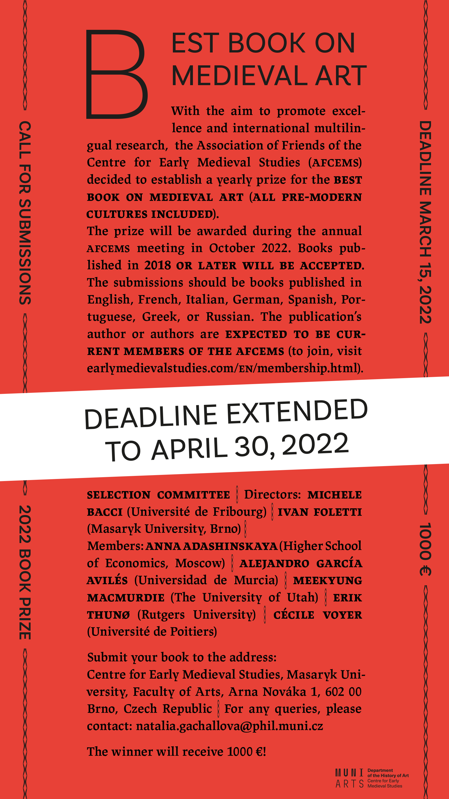 činnostmi Centra raně středověkých studií bychom rádi podpořili excelentní mezinárodní výzkum, a proto si pro vás Spolek přátel Centra raně středověkých studií připravil cenu o Nejlepší knihu o středověkém umění (včetně umění kultur předmoderních) roku 2022. Předložené práce by měly být publikovány v rozmezí let 2018-2022 a v některém z těchto světových jazyků: anglicky, francouzsky, italsky, německy, španělsky, portugalsky, řecky nebo rusky. Cena o nejlepší knihu o středověkém umění bude vyhlášena v rámci výroční schůze Spolku přátel Centra raně středověkých studií v říjnu roku 2022.